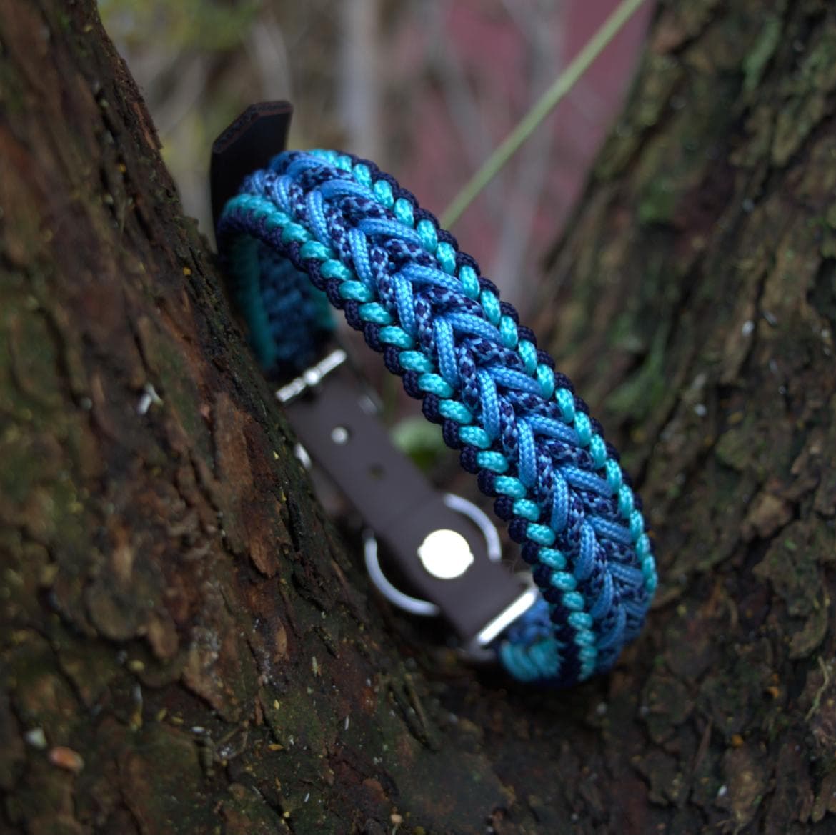 Tiefes Navy mit türkisen Akzenten und marmoriertem Flechtmuster, ruhig und klar wie ein Bergsee.